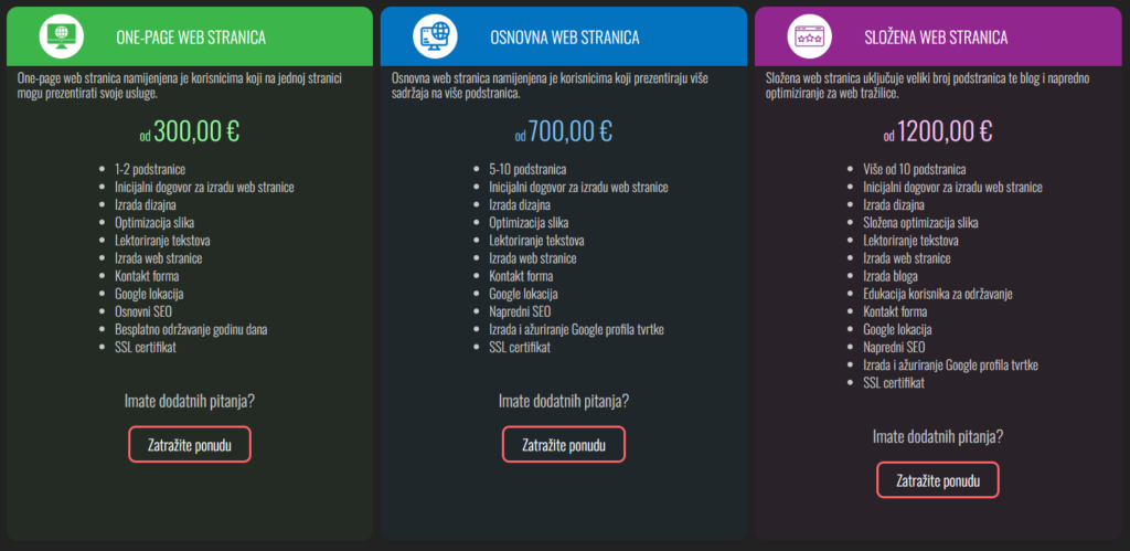 Primjerice, na WebFlare stranici cijena jasno su navedene uključene stavke po paketu, a posebno su odvojeni troškovi održavanja, dodatnih izmjena, hostinga i domene. To je dobar pristup jer klijent odmah vidi što plaća i što eventualno dolazi kasnije.